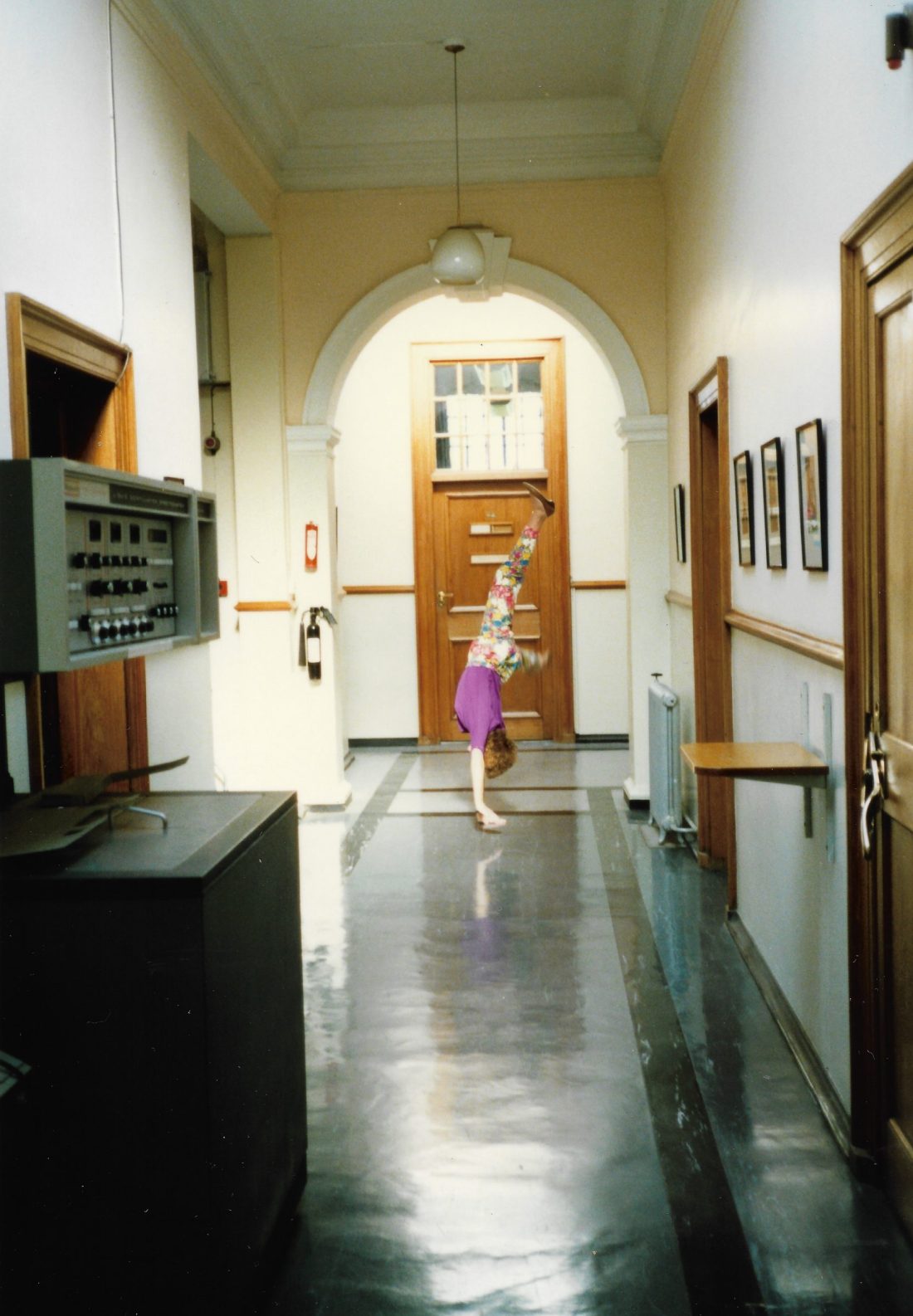 Elaine Griffin performing a cartwheel in front of Professor Henry Harris’s office.